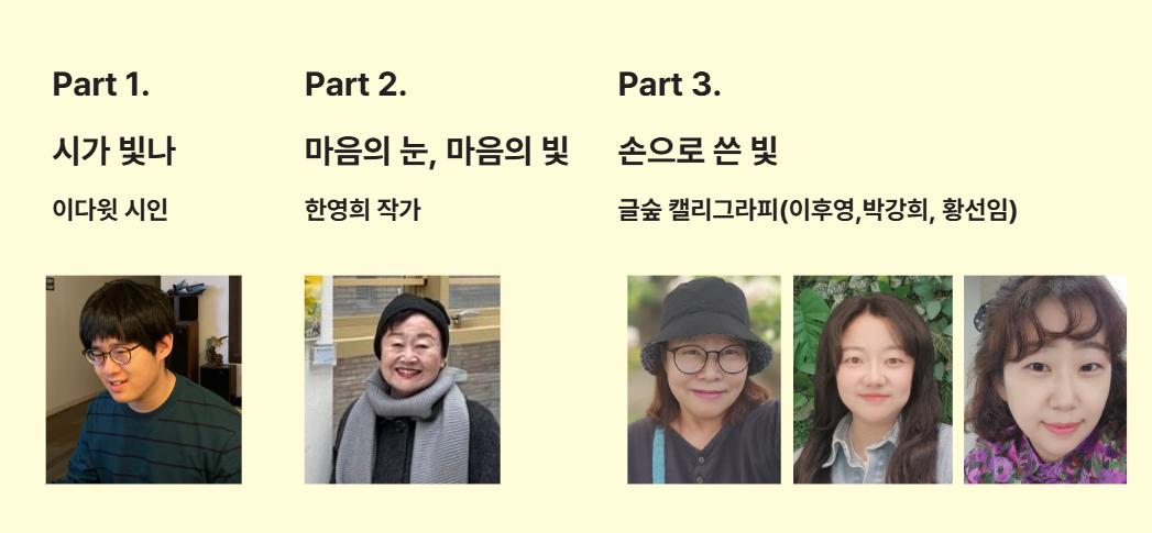 뇌병변 중증장애를 가진 이다윗 시인은 자연과 말씀을 통해 얻은 시의 언어로 세상과 소통합니다.그의 곁에는 든든한 부모님의 사랑과 지지가 함께 했습니다. 시인의 선생님인 화가 한영희 작가는 시력을 일어가며 10cm 앞도 보기 어려운 현실 속에서 남편의 따뜻한 손을 붙잡고 붓을 들어 세상을 그렸습니다. 그리고 이 여정 곁에는, 글을 더 빛나게 만든 따뜻한 손글씨의 캘리팀이 함께했습니다. 이 전시는 서로에게 손을 내민 기록입니다. 서로를 빛나게 한 마음들이, 예술이 되어 우리 마음을 다시 따뜻하게 비춰줍니다. 고개를 돌려 서로를 바라볼 때, 혼자가 아니라 우리가 될 때. 우리는 더 밝게 빛날 수 있습니다. “그렇게 우리는 빛이 됩니다.”