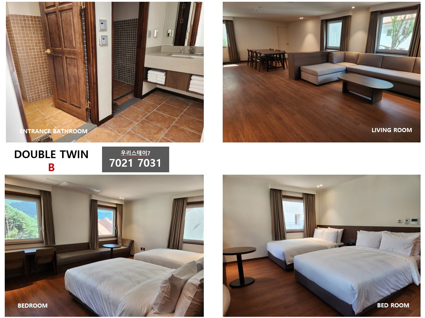 · 침구추가는 인원추가가 가능한 객실에 한하여 1세트(매트리스, 이불, 수건, 생수)당 22,000원의 추가 비용으로 제공되며 예약시 또는 입실당일 17:00까지 요청 가능합니다. (당일 요청시, 수량이 한정되어 제공이 어려울 수 있습니다)