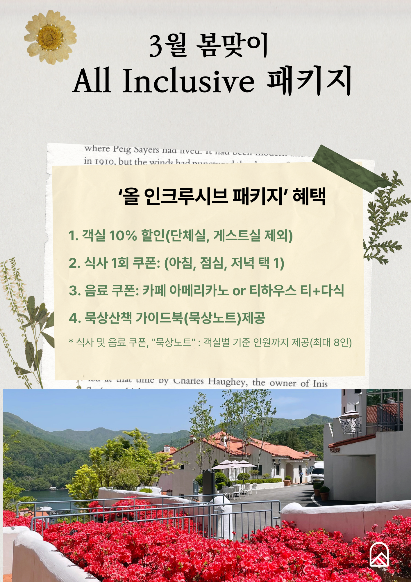 *식사 및 음료 쿠폰(숙박기간 일별), 묵상노트는 객실별 기준 인원까지 최초 1회 제공(최대 8인)