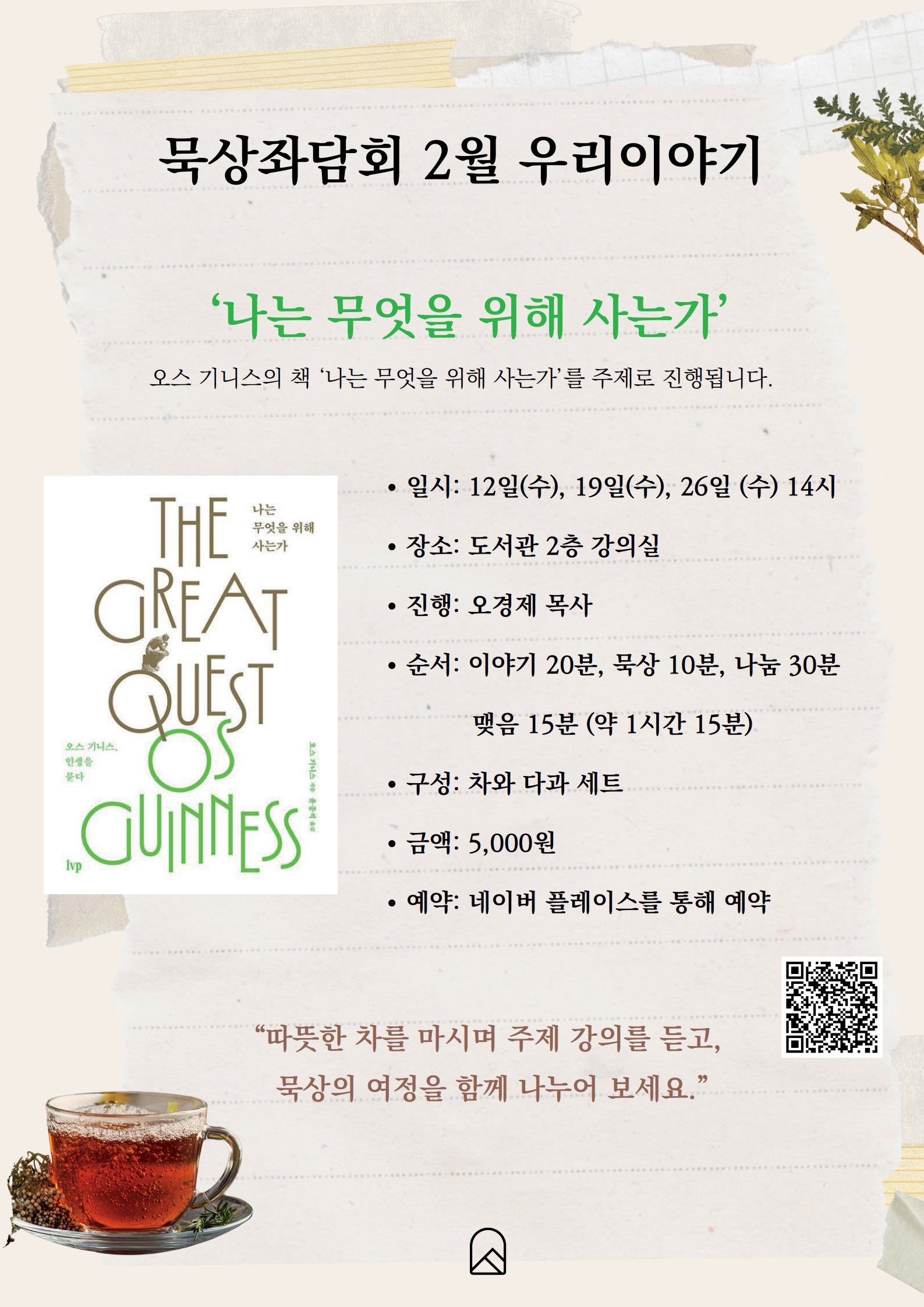 ''따뜻한 차를 마시며 주제 강의를 듣고, 묵상의 여정을 함께 나누어 보세요.''
