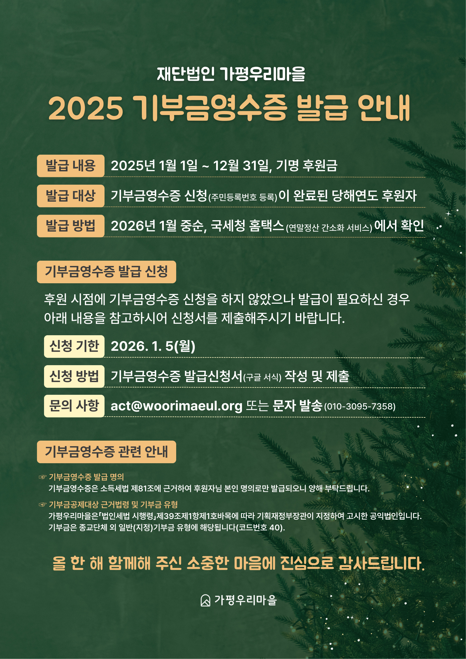 (재)가평우리마을 기부금영수증 발급안내